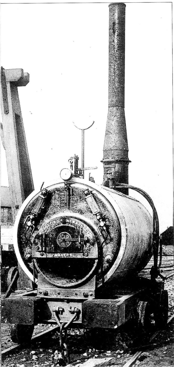 Rail-mounted steam boiler c1890 and built by Abbott & Co Ltd of Newark, for providing steam to drills at the work faces. This is near the workshops, with the wagon lift sheer-legs in the background – from Lafarge Aggregates.