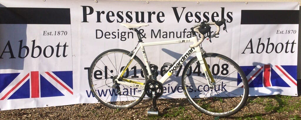 Abbotts sponsored me to ride 450 miles in 4 days for charity from Lands End back to Newark – the bike used was British designed by Chris Boardman – a nice British combination that completed the challenge last Saturday – below is a photo of the combination – good for Abbotts, good for the rider, and most importantly good for the 3 charities we supported !
