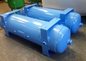 A Pair of frame mounted Compressed Air Receivers with top saddle plates and lower cradles – note use of backing pads with tell tale holes to distribute the loads correctly. Either to BS5169 or EN13445