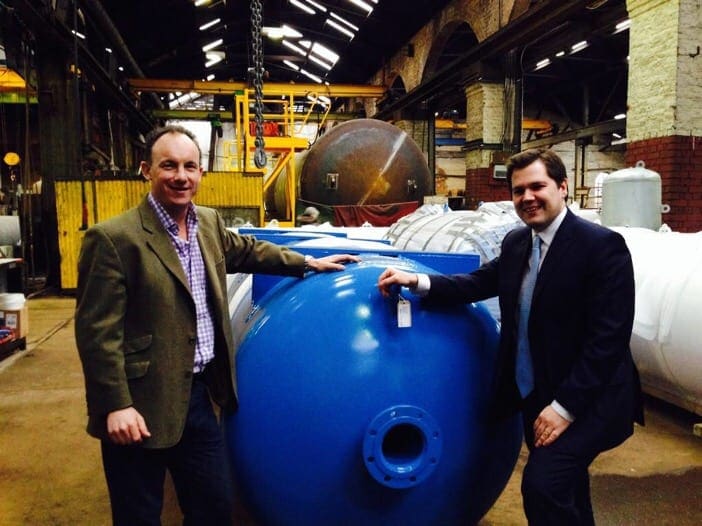 Remember Newark was briefly on the news when Nigel Farage and UKIP tried for the seat after Our last MP Patrick Mercer resigned last year over a cash for questions fracas – well the new Newark MP Robert Jenrick visited recently for a saunter around Abbotts to see what we get up to – see below with our MD leaning on a compressed air receiver built for Gardner Denver – designed to be slung from the rafters of the New Jaguar Landrover Engine facility in Wolverhampton – part of a project GD did to reduce air power consumption by 26% per year – a prestigious job and (ignore the politics !) that reflects our UK manufacturing in a very positive light.