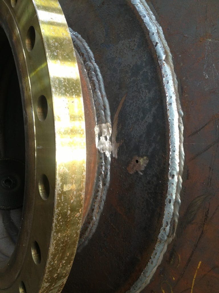 The photograph below shows a compensating ring on a pressure vessel built by Abbott & co. The 6mm telltale hole is located on the right (these can be threaded and have a nipple screwed in). Under certain circumstances compensation may me added to a vessel or air receiver at a later date and the vessel modified to suit.