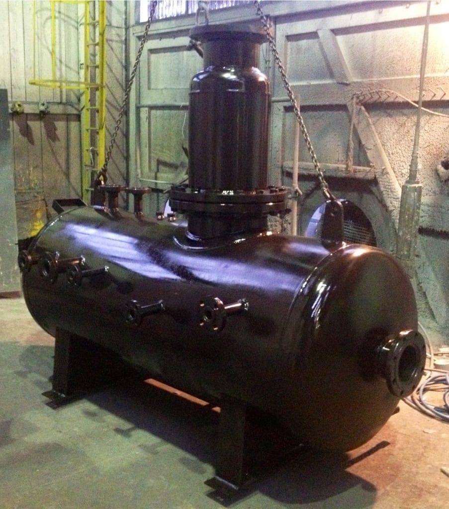 Steam Flash Tank built to PD5500 Category 3. CE marked for use in Europe and UK with Lloyds Register for third party approval. This steam vessel collects water to return to the feed and allows dry steam to be returned the system. Built with pressure vessel grade steel P265GH with 3.2 Certs, coded welders to EN287 and supplied with declaration of conformity, notified body test certification and CE marking through our PED approved works.