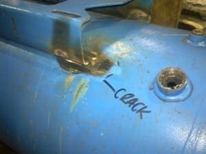 Vibration from the compressor mounted on top has caused the shell to crack – fortunately the crack was localised the escaped and no one was injured.