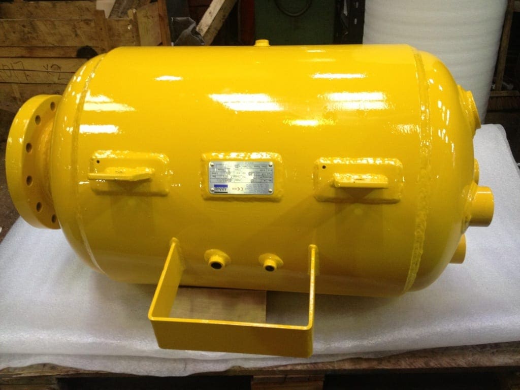 Yellow Air Receiver 25 Bar Working Pressure with many 2 inch outlets for compressed air distribution